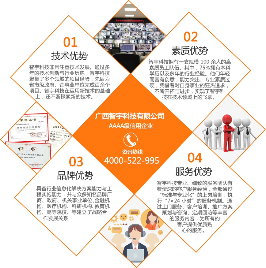 廣西智宇科技有限公司,自1995年成立以來,已發(fā)展成為一家高新技術(shù)企業(yè),擁有多家分公司,遍布南寧、桂林、玉林、河池、扶綏、百色、欽州、防城港等地。憑借30年的專業(yè)經(jīng)驗和技術(shù)儲備,智宇科技已成為一家行業(yè)領(lǐng)先的集團企業(yè),致力于運用前沿科技產(chǎn)品和技術(shù),為客戶提供高效服務(wù)。